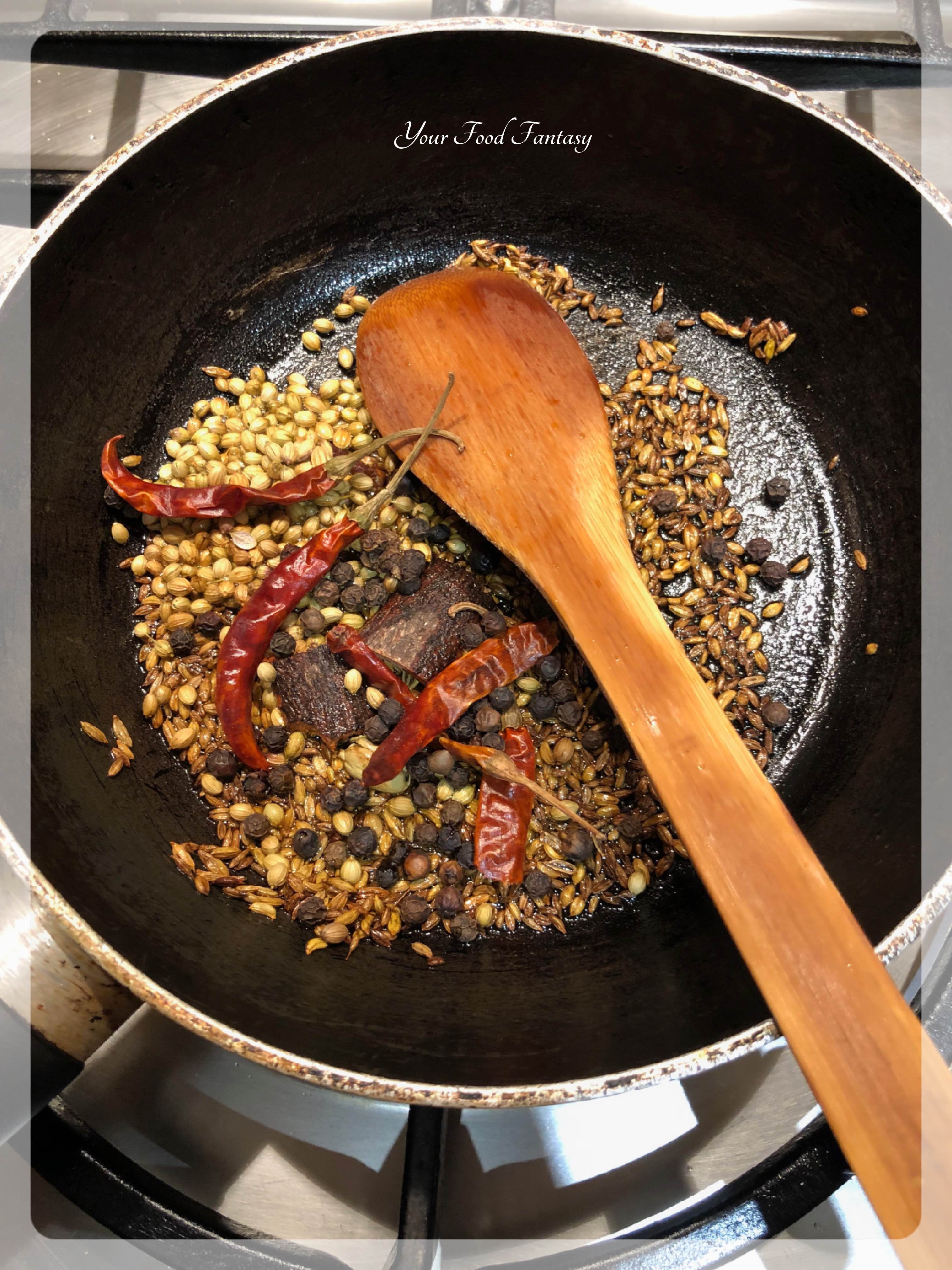 - Heat a pan over medium heat and add all the ingredients listed under Chettinad masala category one by one and roast them for 7-8 minutes.