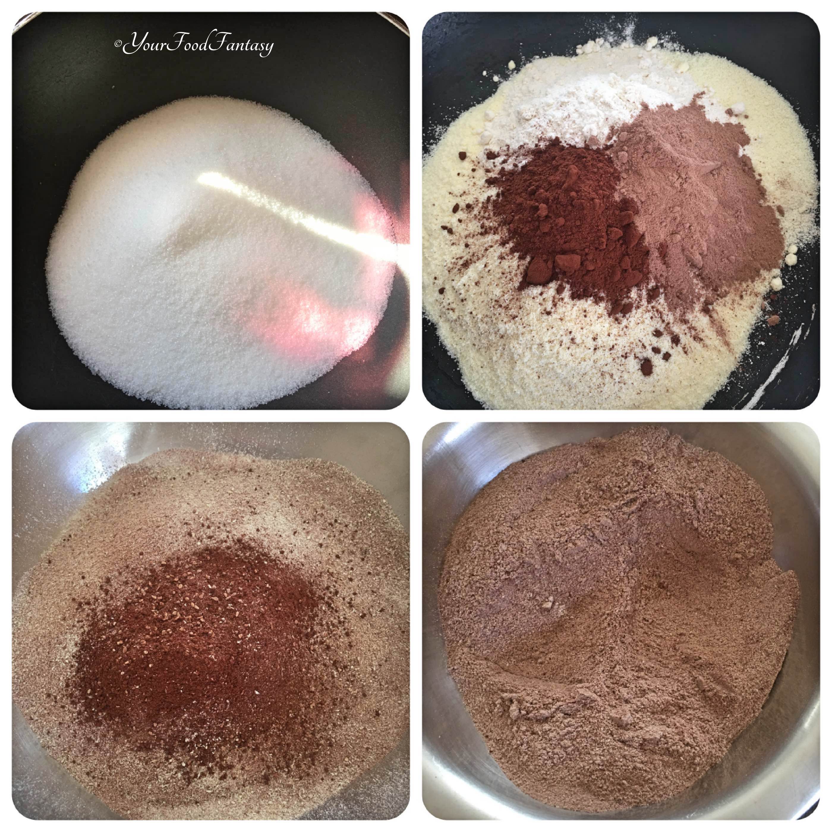 - In a mixing bowl, add milk powder, maida, cocoa powder, drinking chocolate powder, and baking powder and mix well. Now with the help of a sift, sieve it through twice.