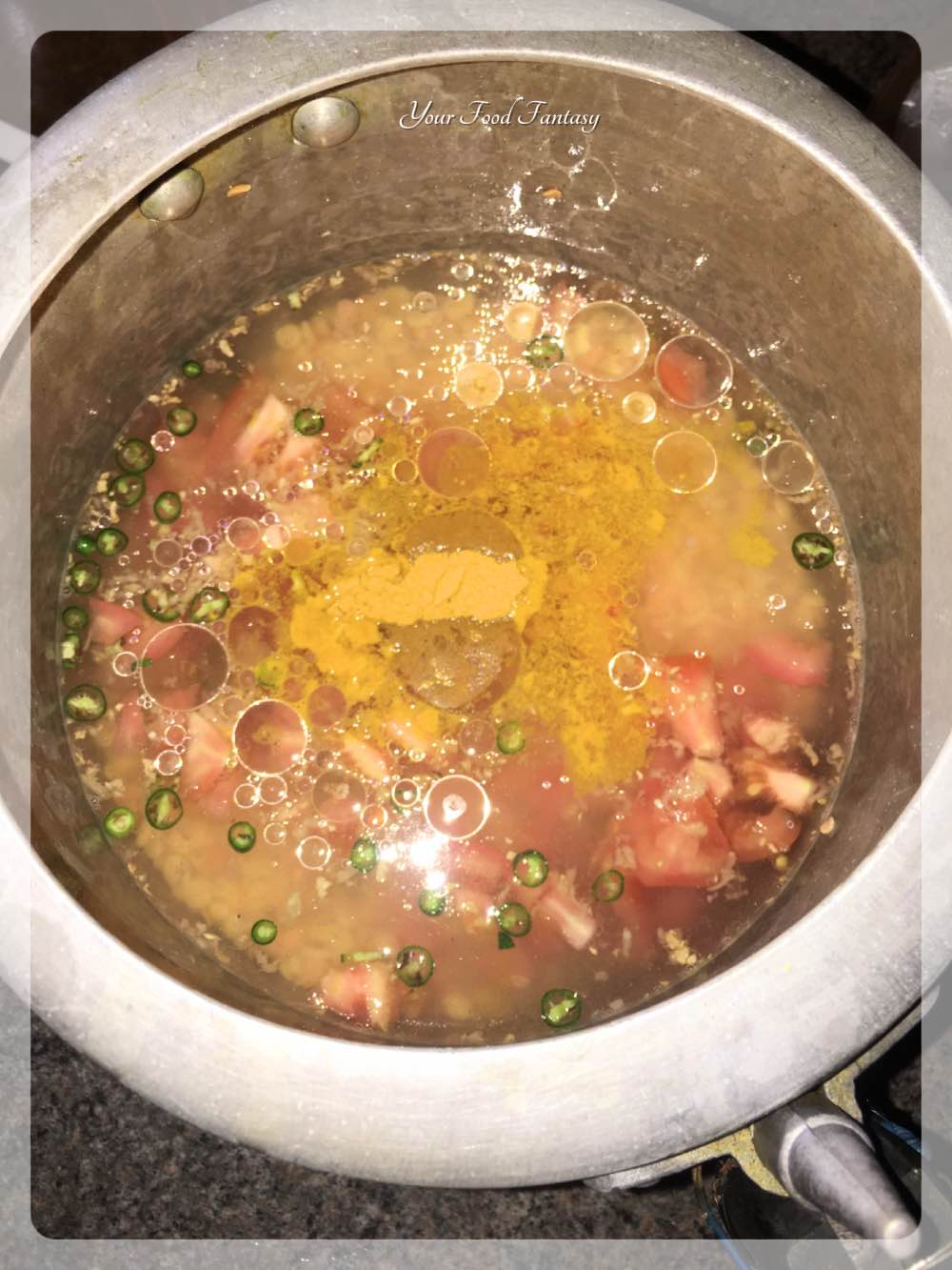 - Add chopped tomatoes and chillies, grated ginger, salt, turmeric powder and 1 tablespoon of ghee/clarified butter/oil to the Dal and stir to mix. Close the lid of the pressure cooker and cook for 1 whistle. Switch off the heat and wait for the release of pressure completely, before opening the cooker.