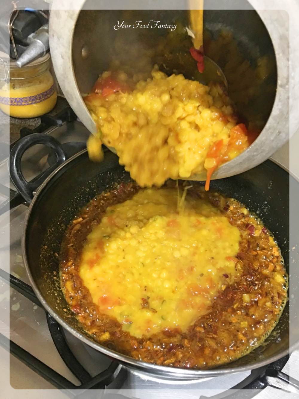 Making this Dal tadka / fry comprises of boiling (pressure cooking) the lentil and then frying with onion, cumins seeds, etc in clarified butter (ghee). Addition of ghee and few other spices elevates the taste.