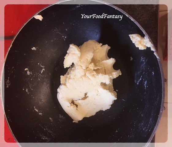 - First of all, take khoya in a mixing bowl. First grate it and then mash it well with the help of your hands so that there is no lumps or small bits in the khoya.