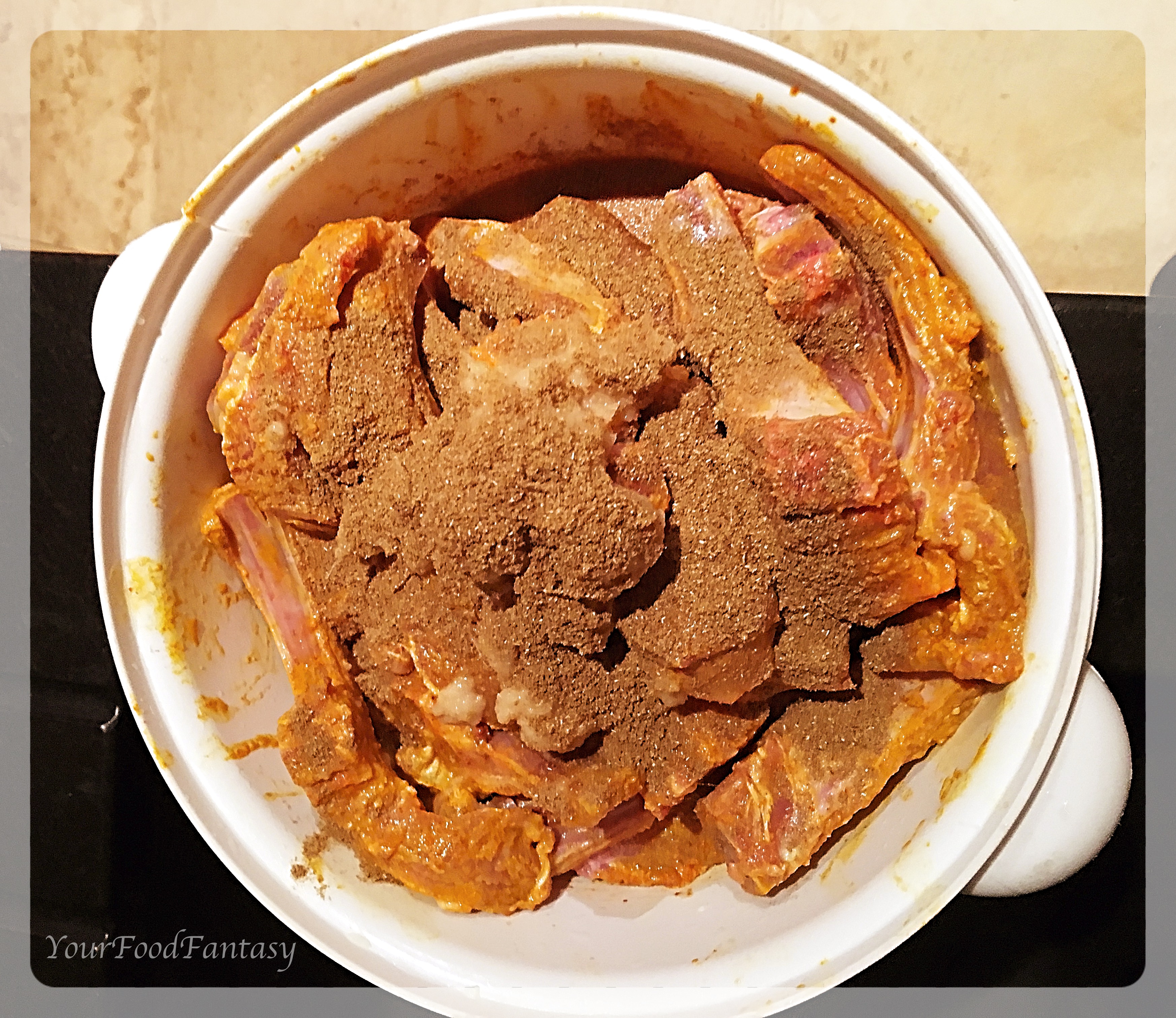 - Add dried mint leaves, yogurt, garam masala to the lamb chops. Also crush the fried onions with the help of your hand and add it as well.