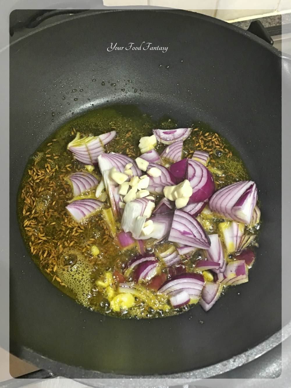 - In a pan/Kadhai, heat oil and add asafoetida and cumin seeds. Add chopped onion and garlic and fry them till they are pinkish golden in colour.