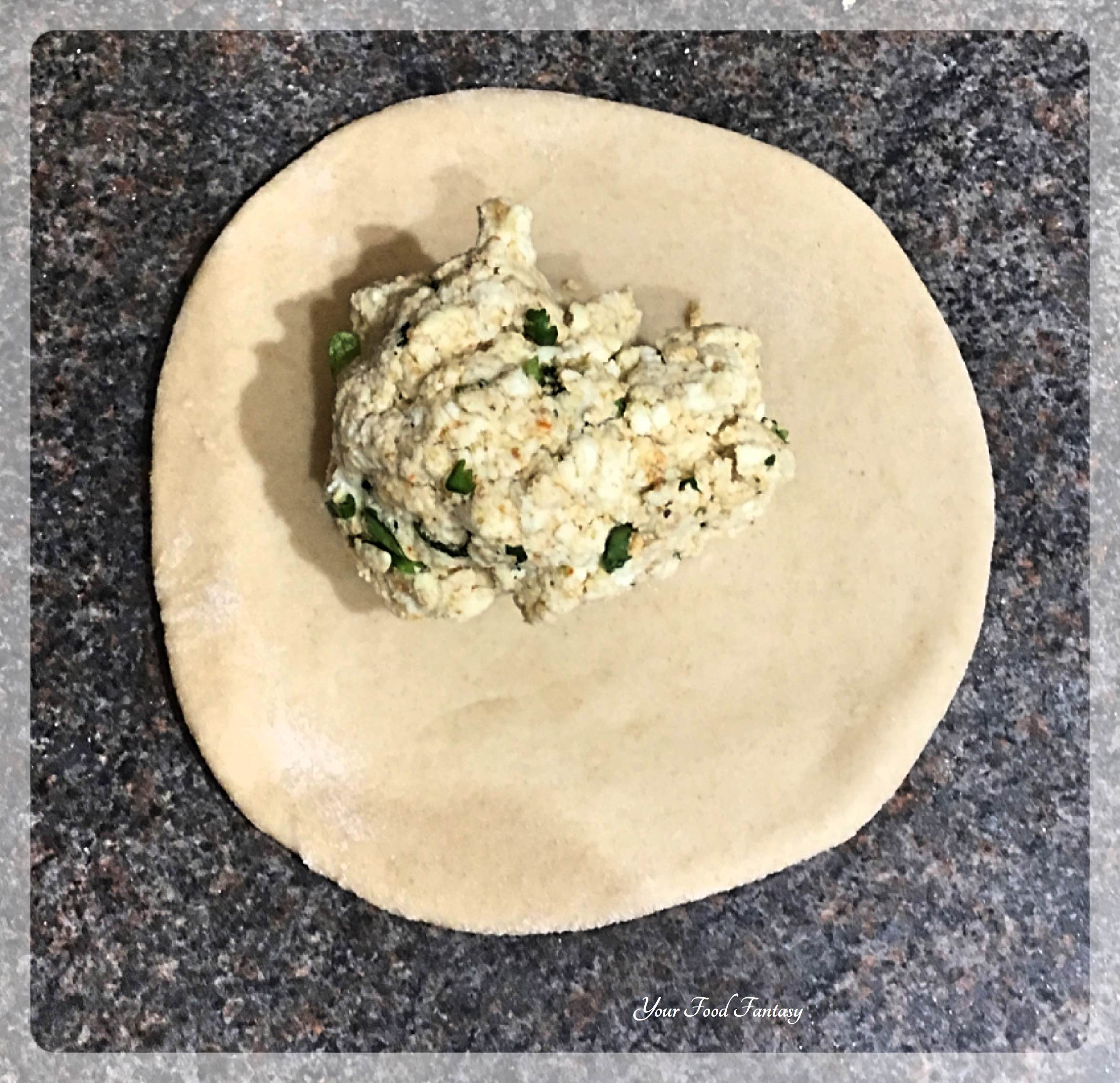 - Sprinkle some dry flour on the surface where you will roll the paratha. Take one ball and roll it into 2.5-3 inch diameter circle. Place 2 tablespoon of stuffing in centre and gather all the sides of circle together and make a round ball again. Roll this into a 6-7 inch diameter circle.