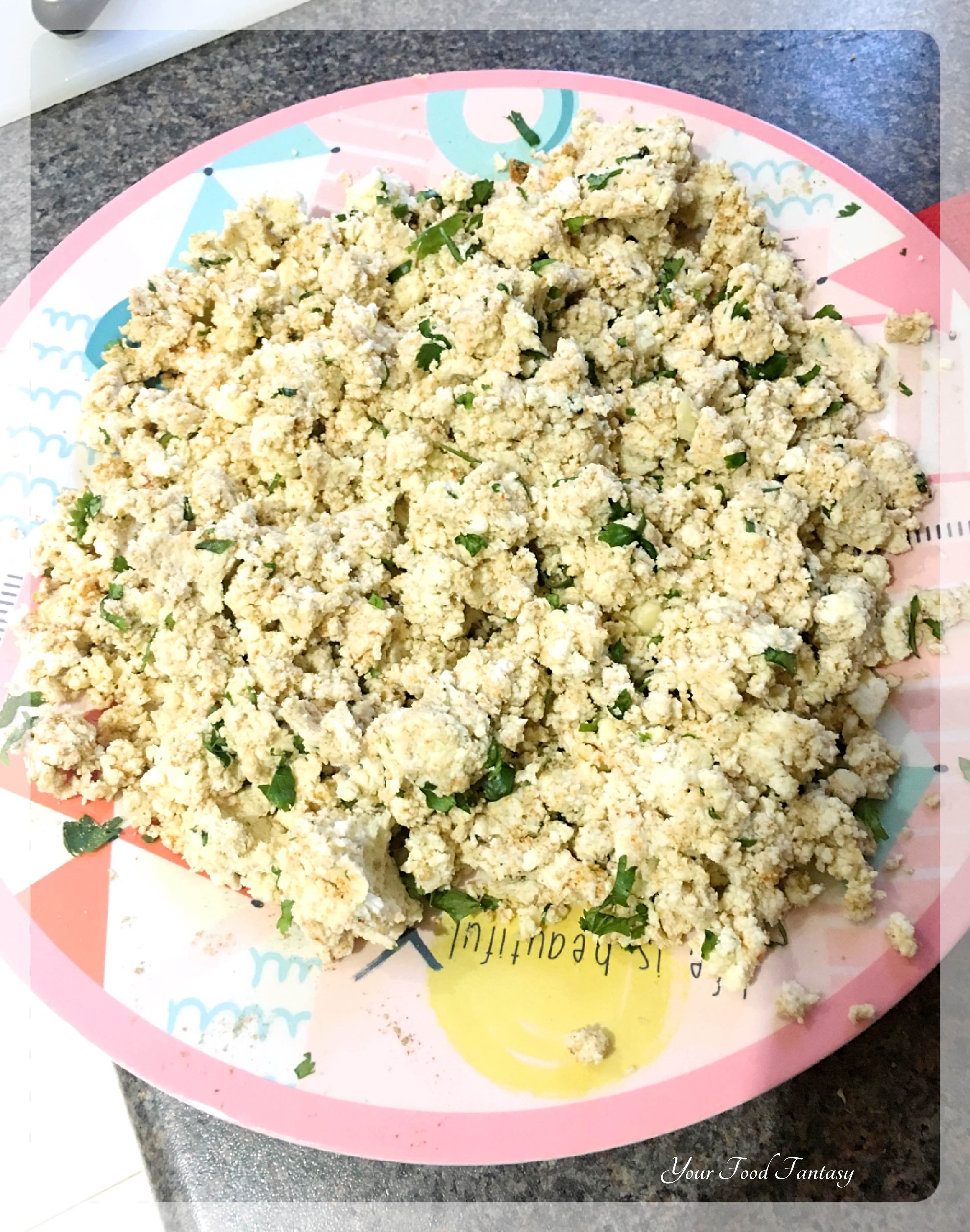 - In another mixing bowl, add grated paneer with all the spices, chopped chillies and coriander leaves. Mix it well. Our stuffing is ready.