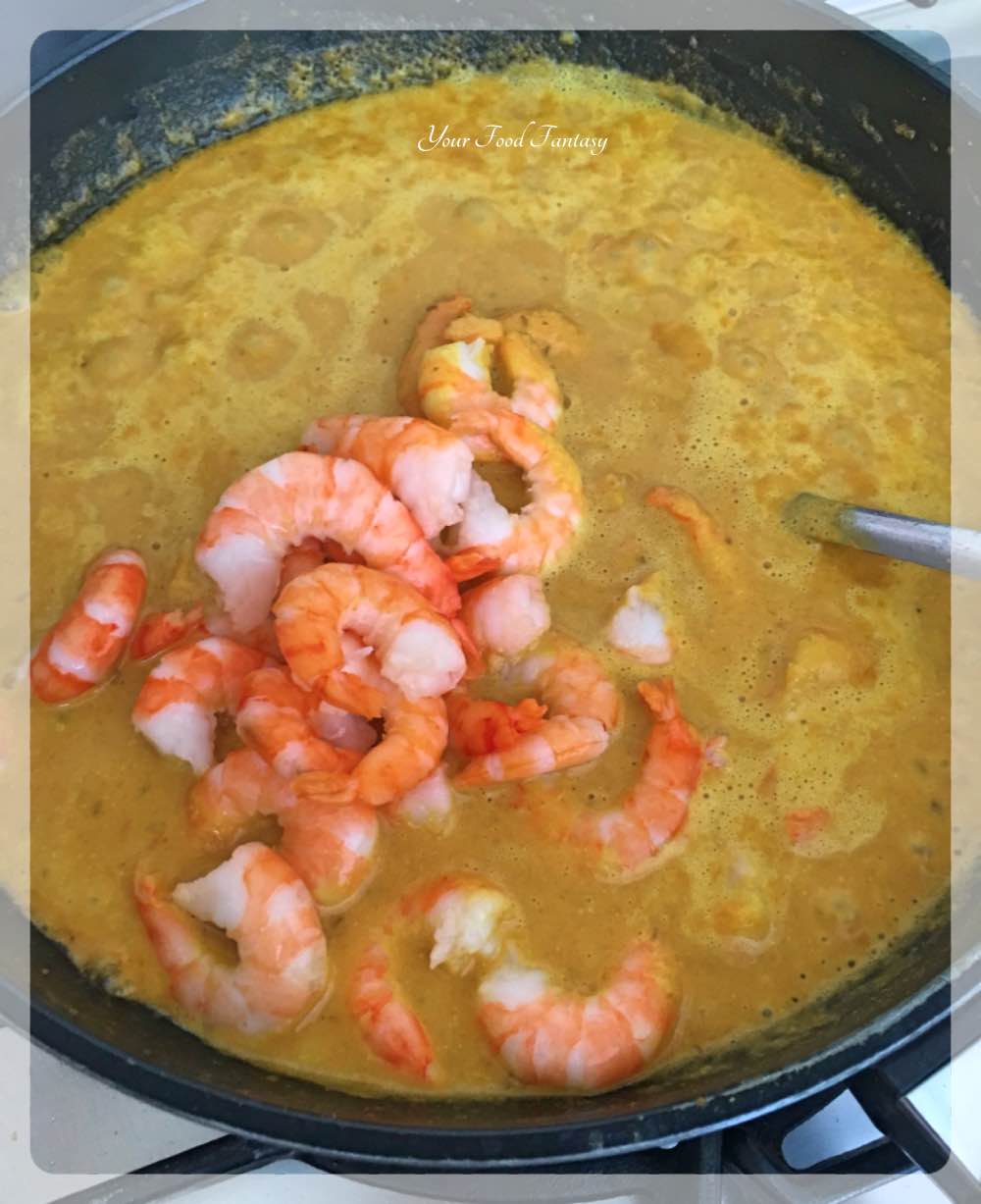 - Add the prawns, coconut milk, salt and 1/2 cup of water into the pan and cook for 10-12 minutes. Switch off the heat.