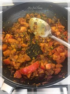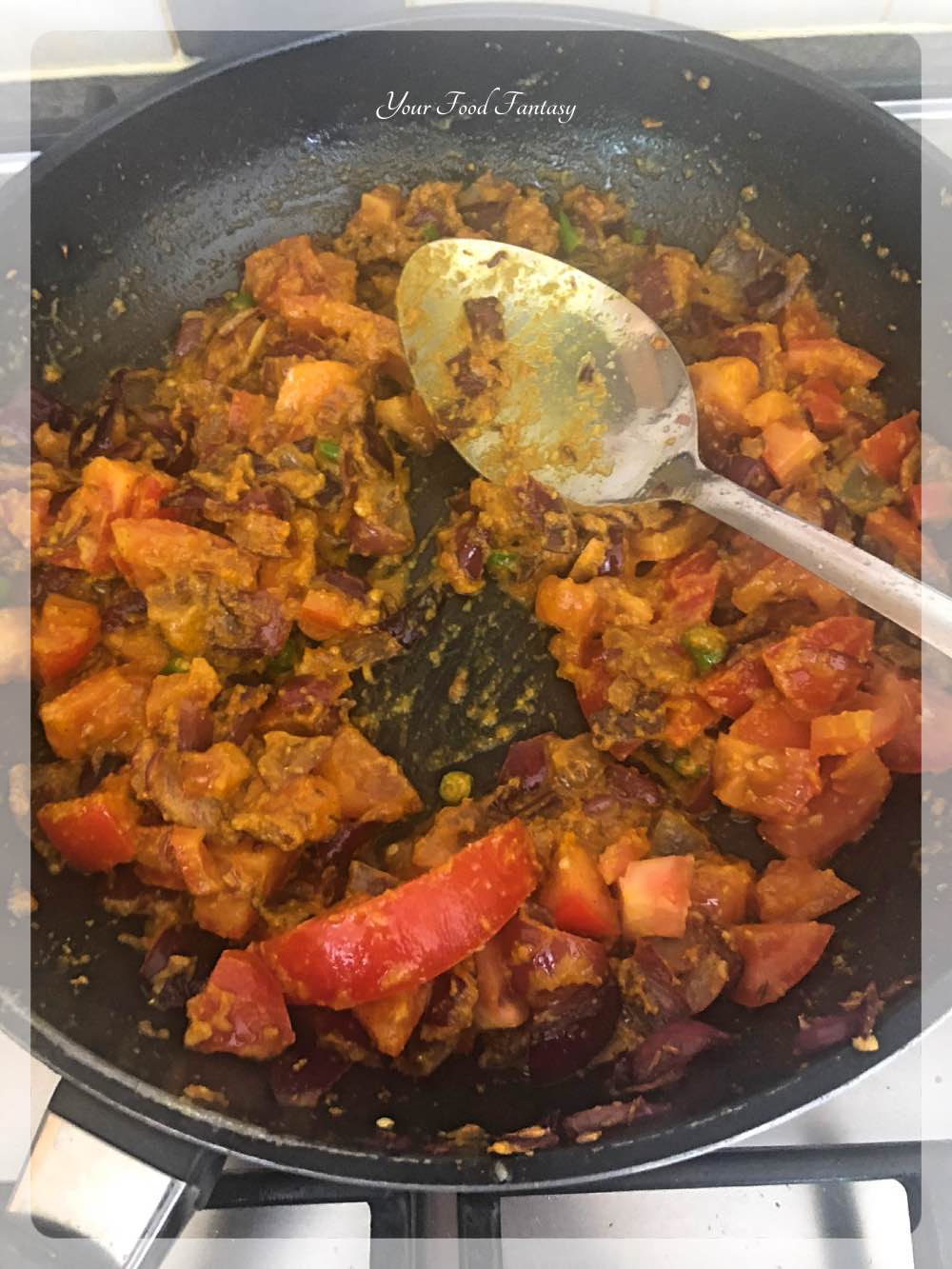 - Add tomatoes, sugar, red chilli powder, turmeric powder, cumin powder and sauté again for a minute.