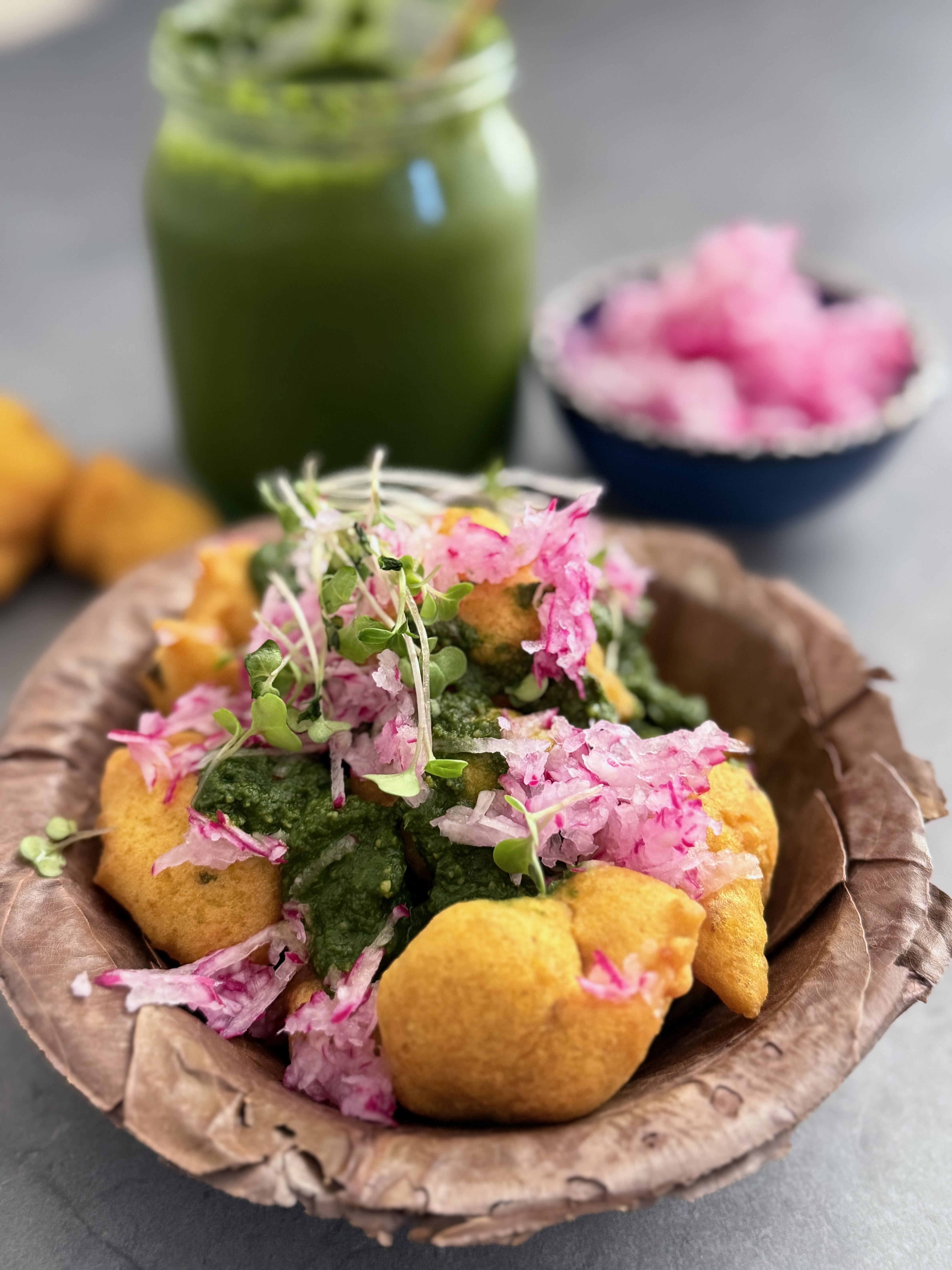 Lentils (moong dal and chana dal), spices, and chutneys, topped with radish.