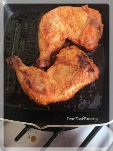 Heat a grill pan or tava over medium heat and pour 1 tablespoon of oil all over it. Place the chicken leg gently and let it cook for 15 minutes over low to medium flame.