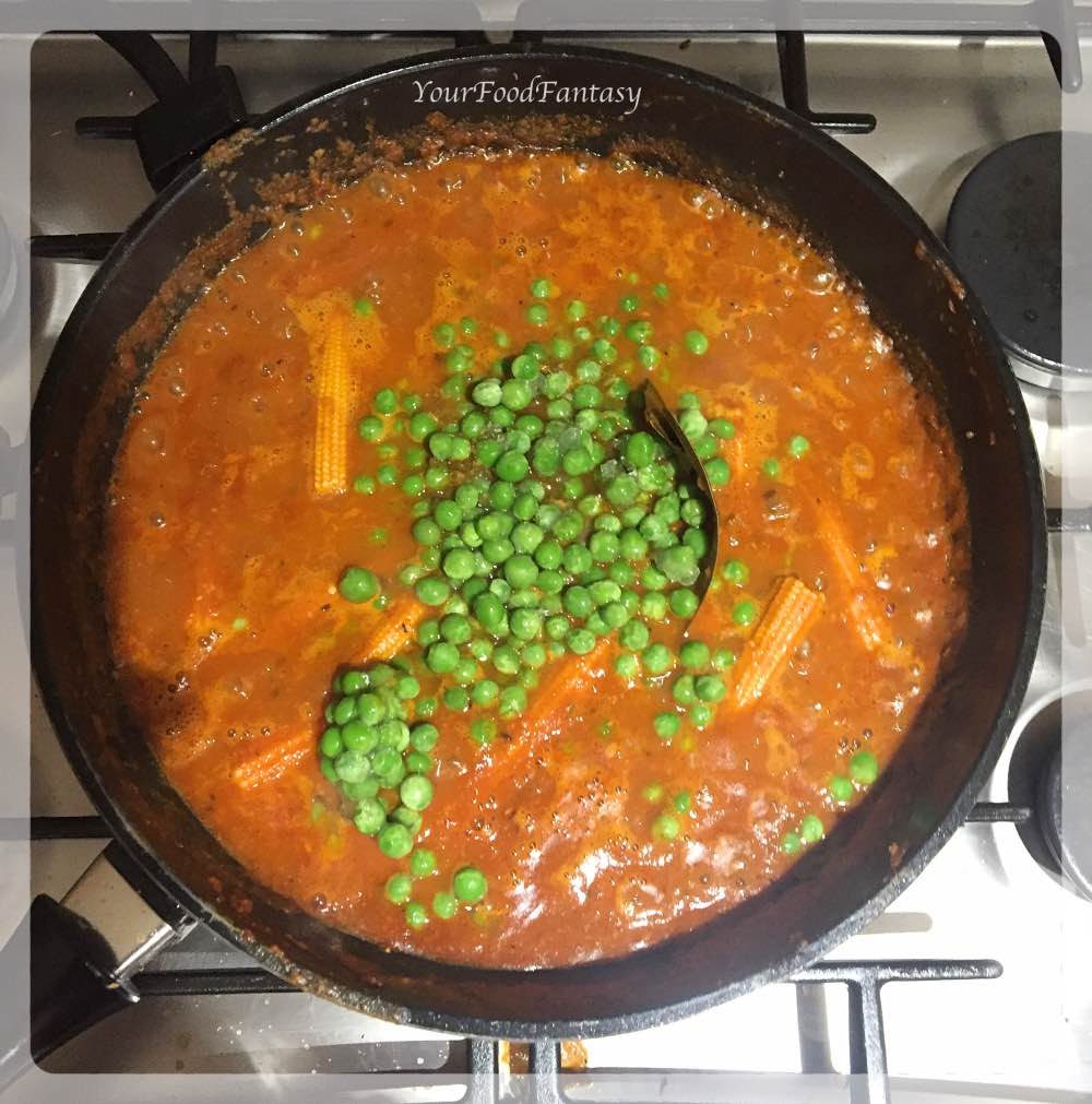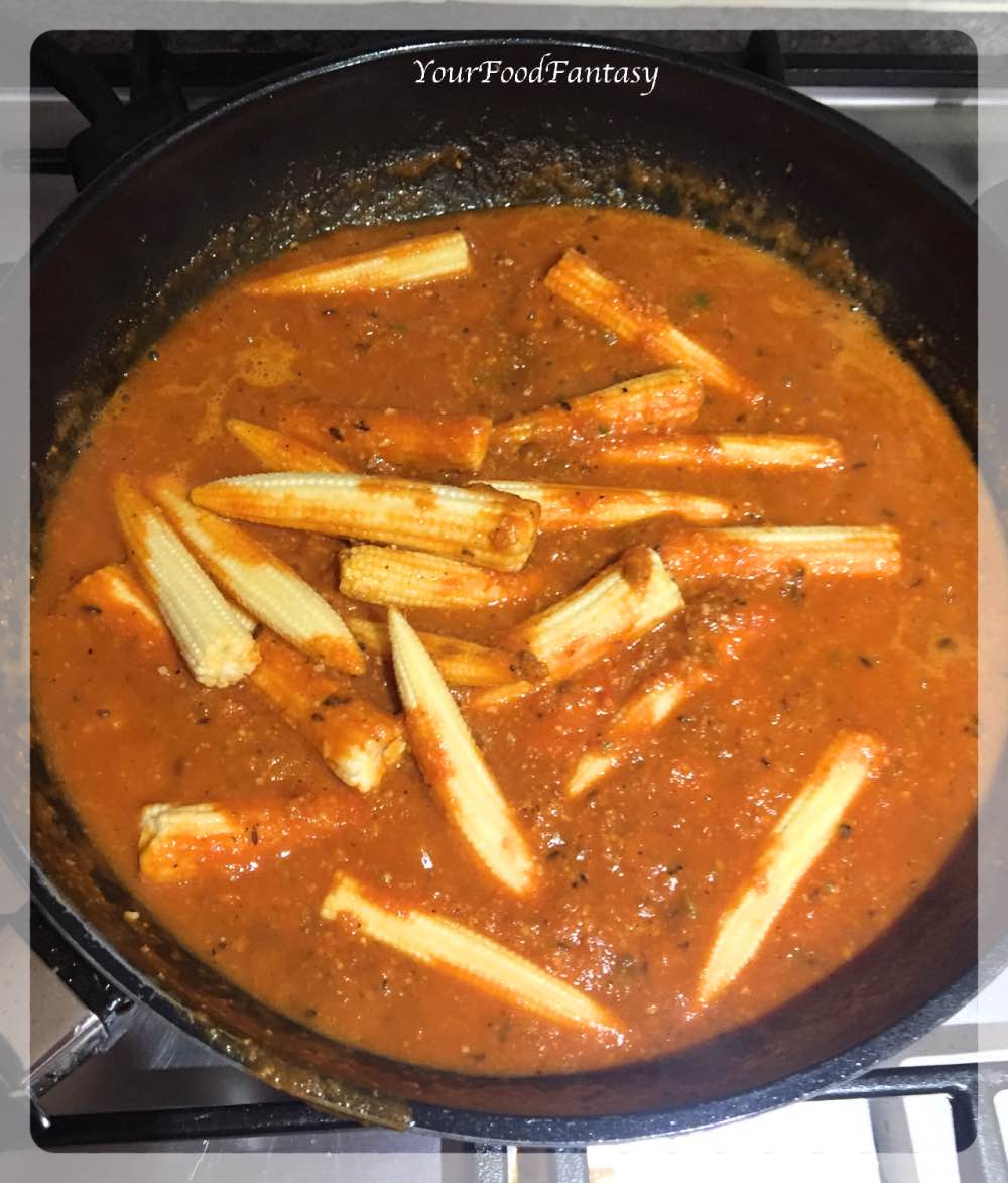 Add washed and clean baby corn in this gravy, reducing the heat to low-medium setting.