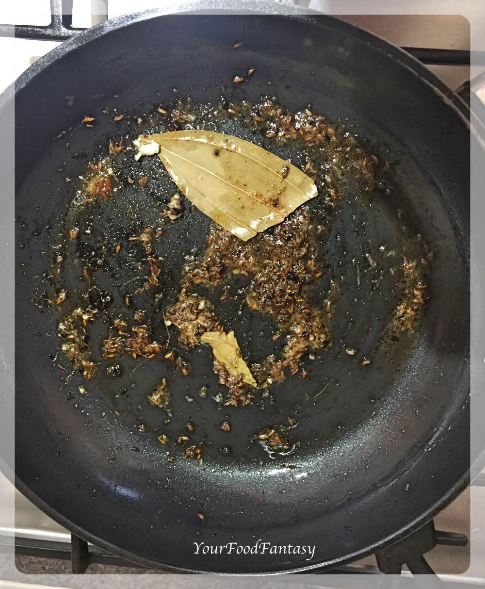 Now place clean pan back on heat, and add 1 tablespoon of oil. Once oil is hot, add cumin seeds and let it crackle. Subsequently add bayleaves..