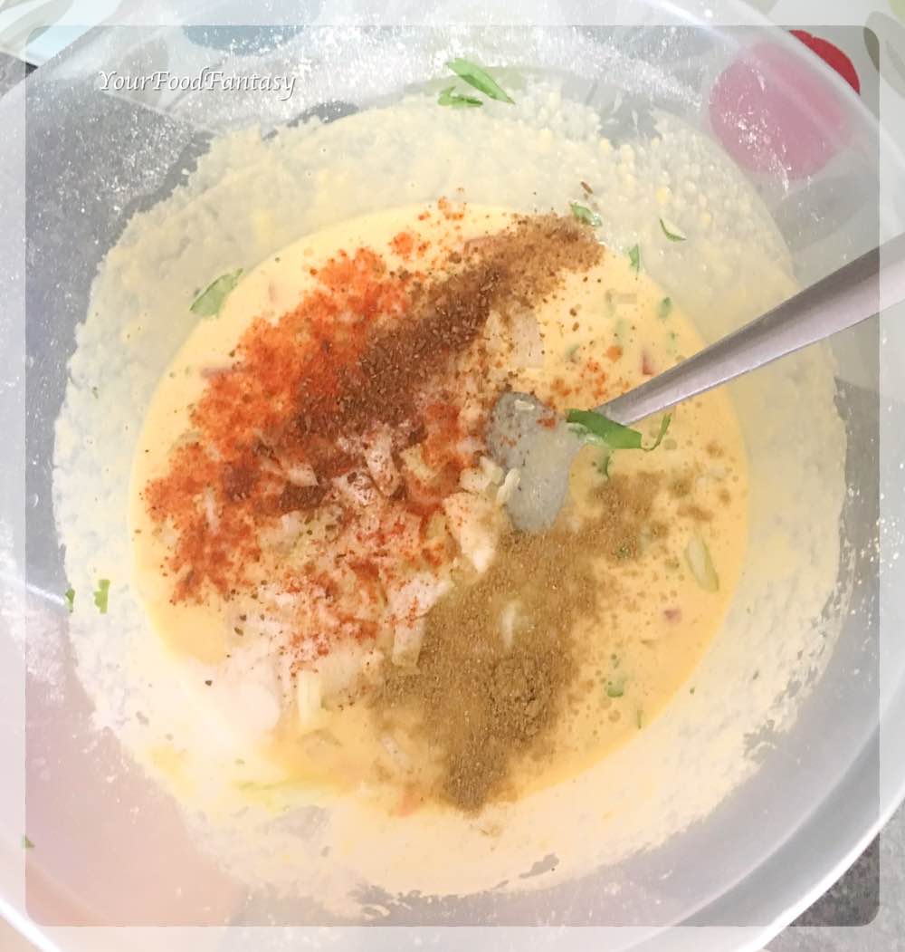 Now add salt, Chilli powder, turmeric, roasted cumin powder, chaat masala and carom seeds and mix well.