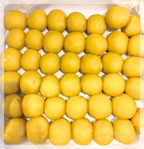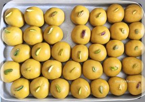 Mix this mixture with your hand thoroughly and start making round balls of it by taking 1.5 tablespoon of this mixture and shaping it like a ladoo in between both of your palms. Make all the ladoos like this.