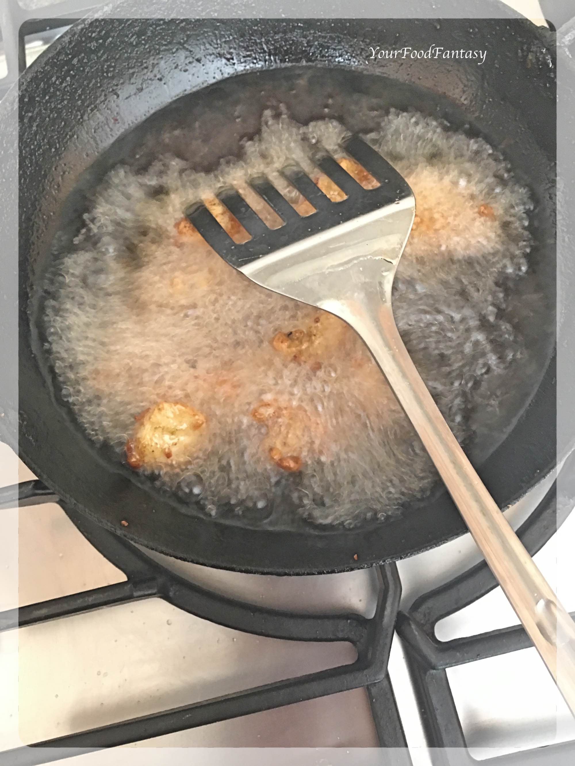 In an another pan, take 2 spoons oil from the same oil which we used to fry the chicken pieces. Add garlic and saute for about a minute.