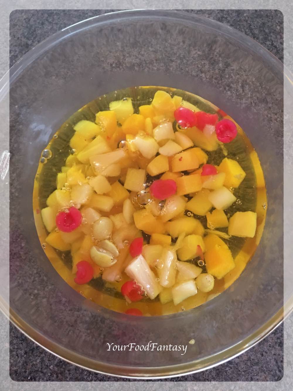 Now pour the jelly water over fruits in the bowl. Now keep it in the fridge for sometime till its completely set, which should take around 20 minutes. Now the base layer of trifle is done.