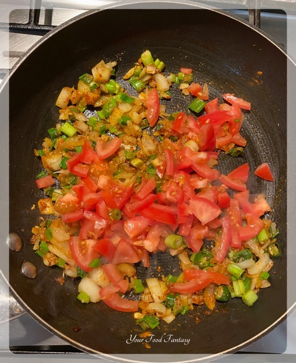Add chopped tomatoes and green chilli, and fry till tomatoes are mushy.