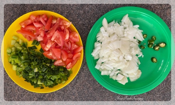 First of all chop onions, green chilli and tomatoes. Also chop spring onions.