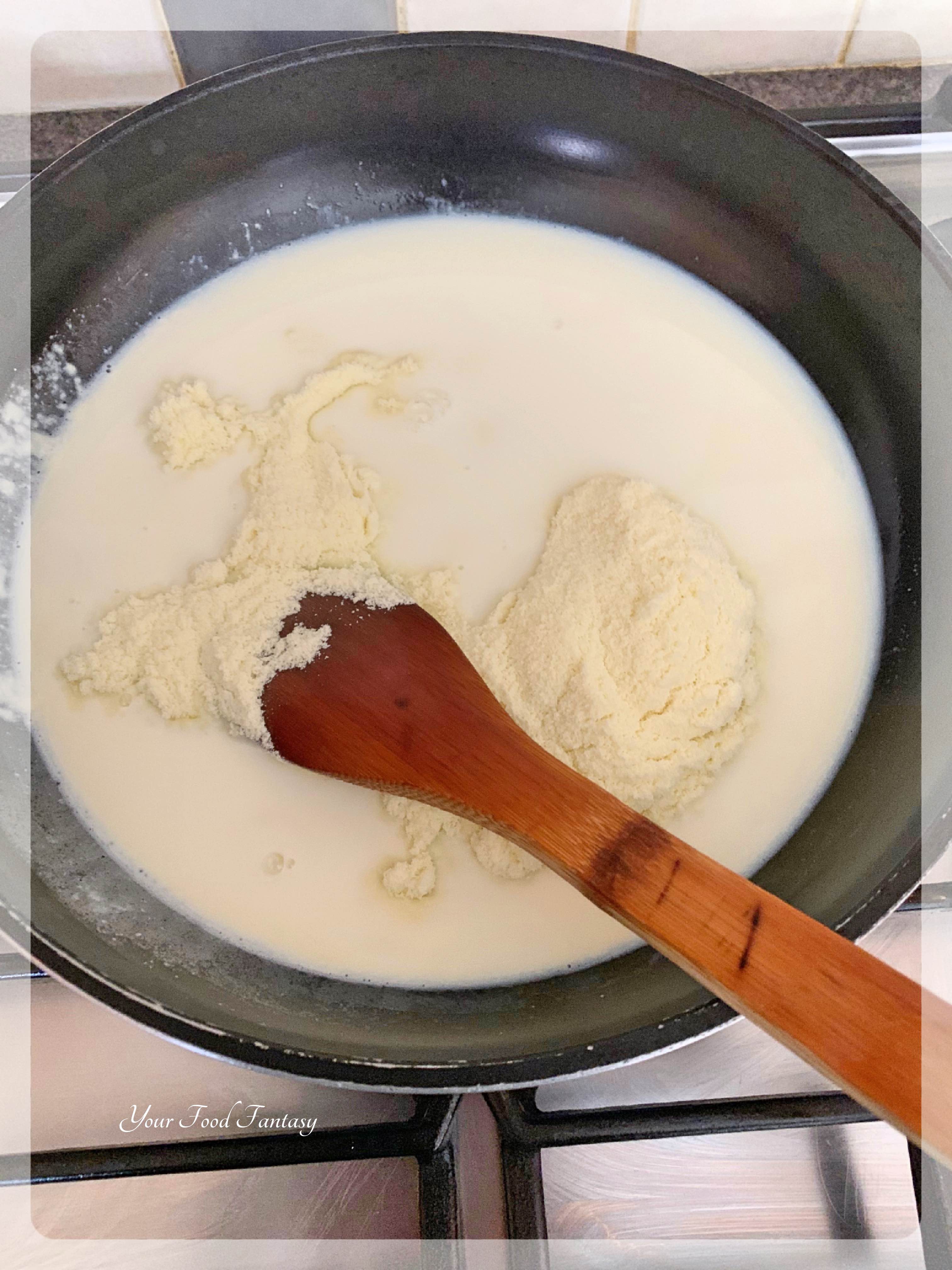 Heat a nonstick pan over medium heat. Add ghee to it and once it’s warm add milk as well as milk powder to it. Stir continuously to avoid formation of lumps.