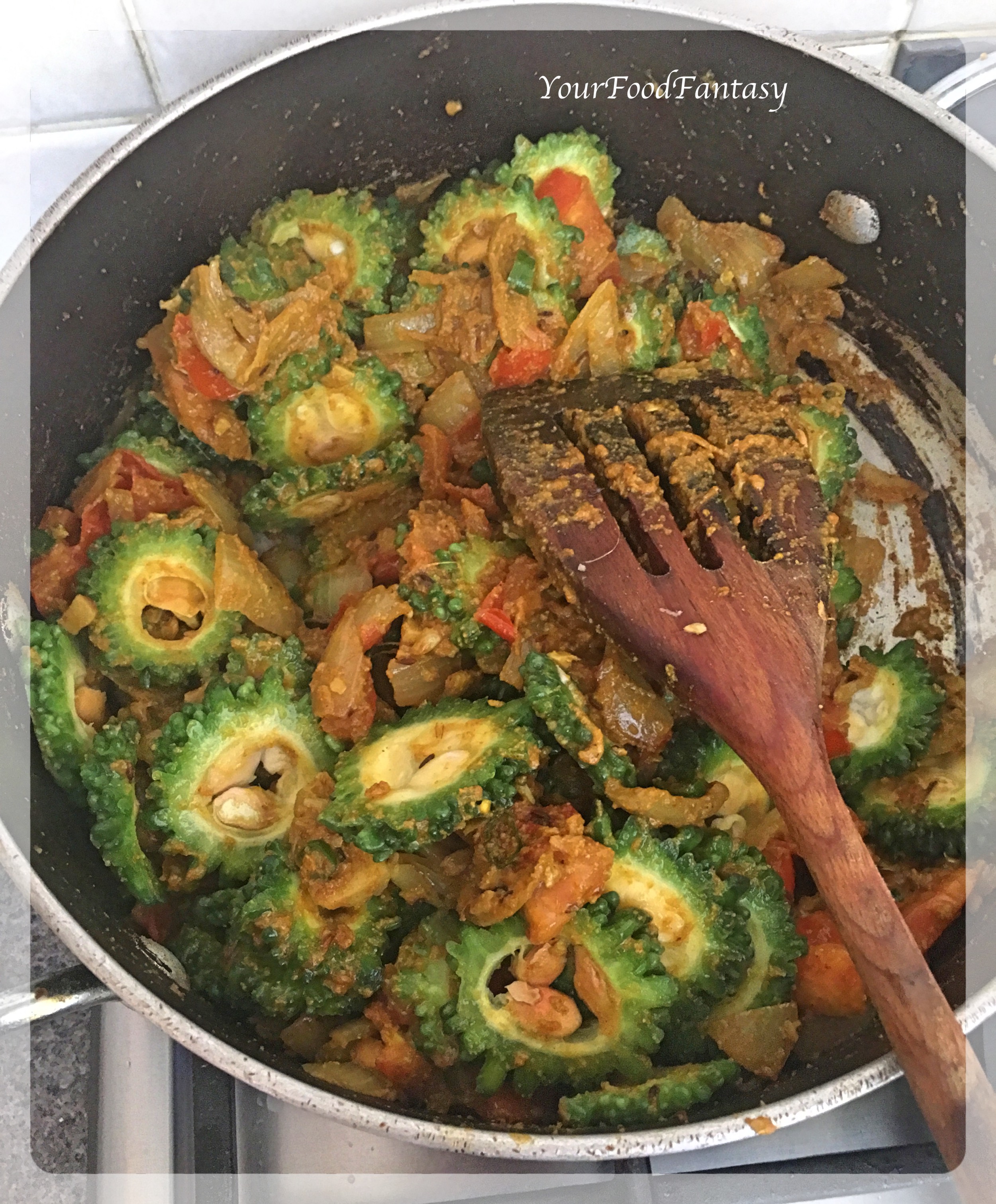 Add the Karela wedges and mix well. Cover with lid and let them cook for 10 minutes.