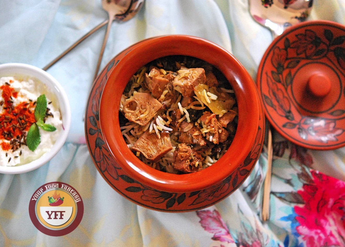Spread half of the cooked rice over kathal and sprinkle some golden fried onions, mint leaves, coriander leaves and saffron soaked milk.