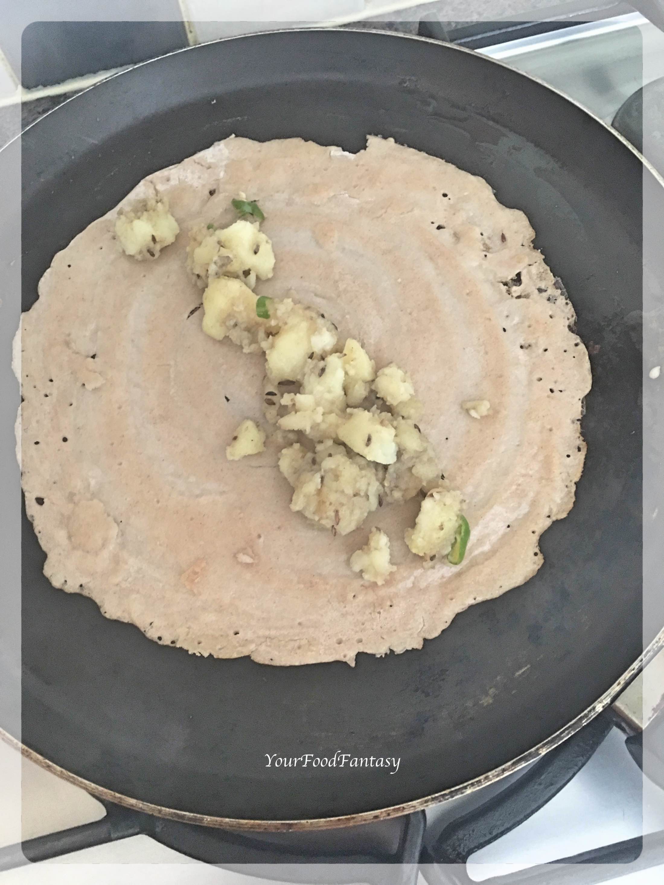 Now place two tablespoon of stuffing in the middle and scrape the dosa from sides to the centre with the help of spatula.