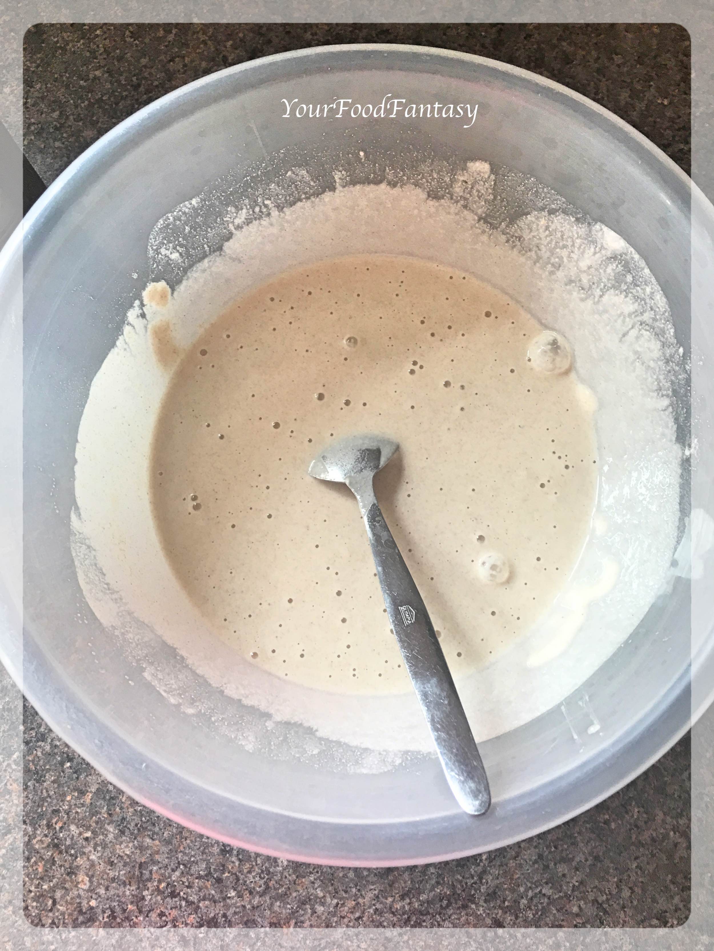 In a mixing bowl, add yogurt and buckwheat flour and whisk them together with 1/2 cup of water to make a smooth batter. Add salt, mix it again and Keep it aside for 5 minutes.
