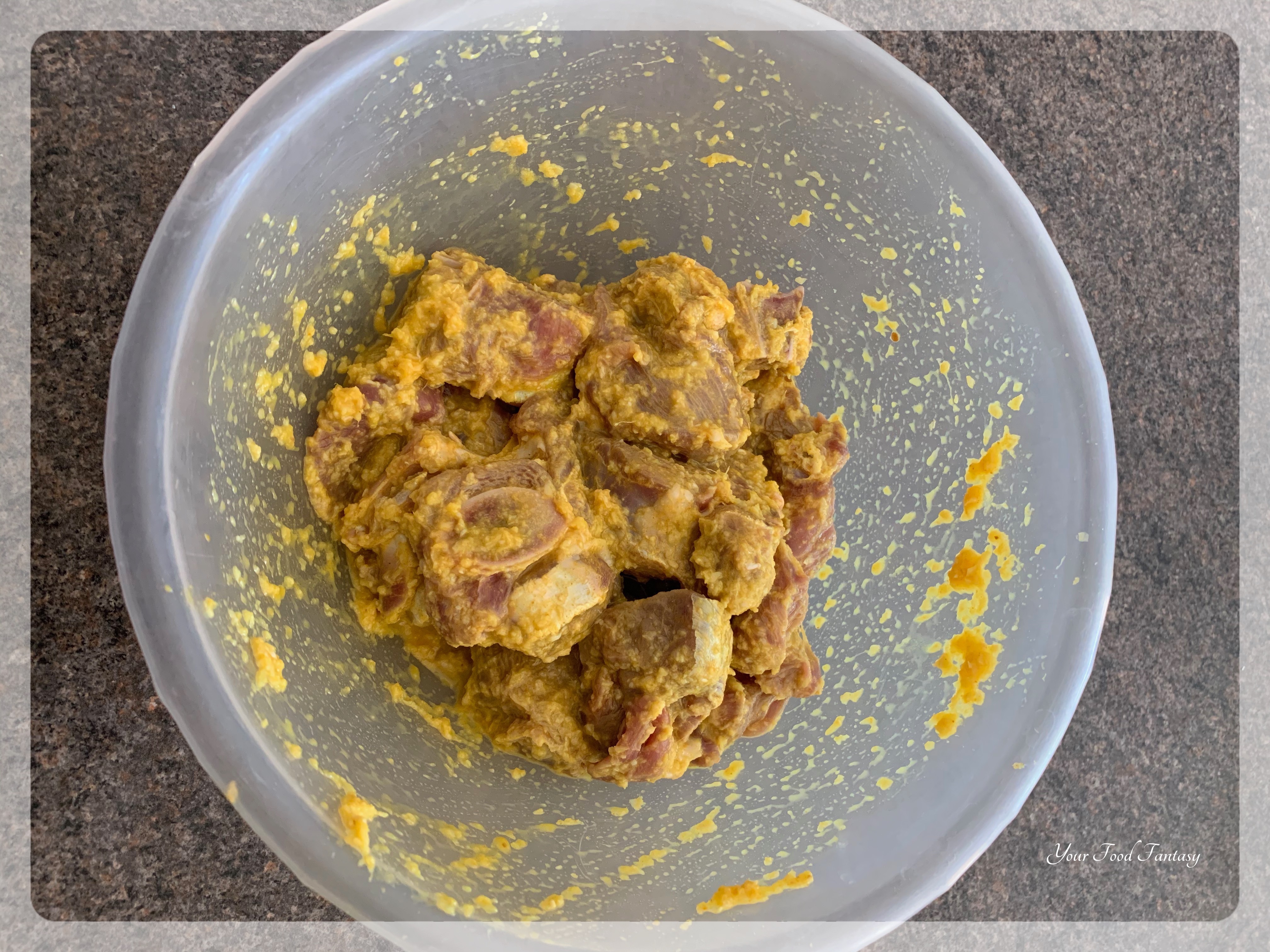 First of all, marinate lamb pieces in a bowl for 2 hours with ginger garlic paste, lemon juice, and 1/2 teaspoon of salt.