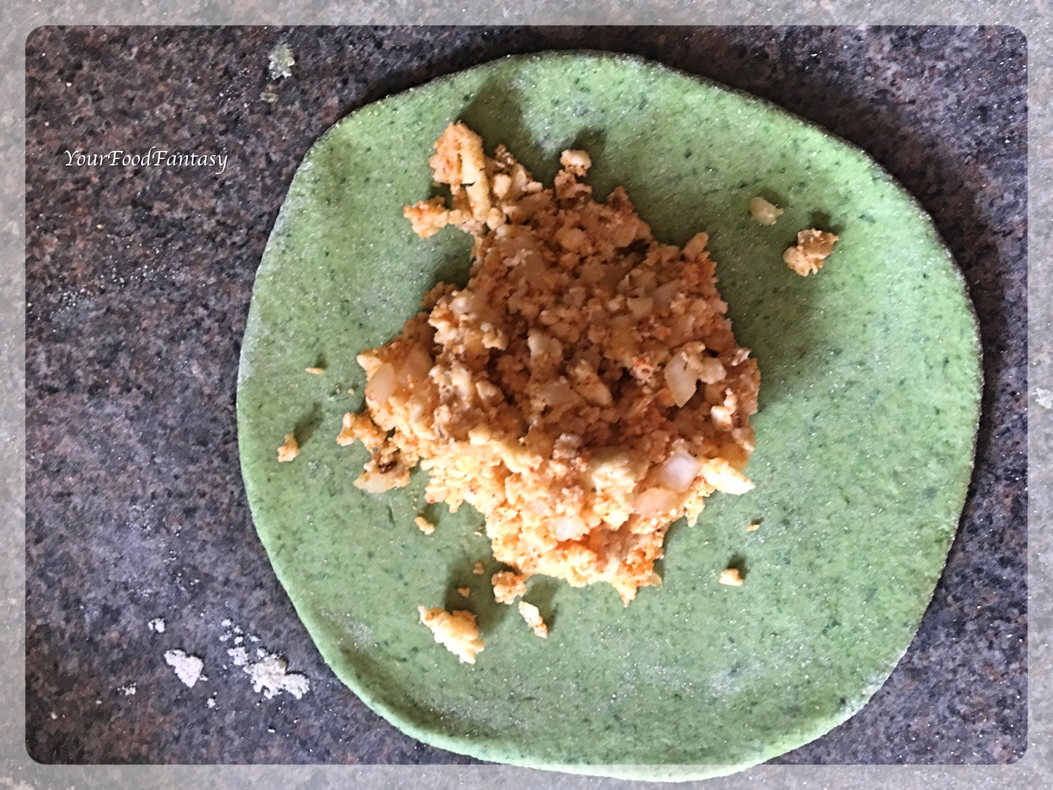 Now divide the dough into 6 equal parts and make round balls of it. Take one ball, and with the help of dry wheat flour, roll it into a small circle with a rolling pin.Now place 2 tablespoon of paneer stuffing and gather all the ends and seal it.