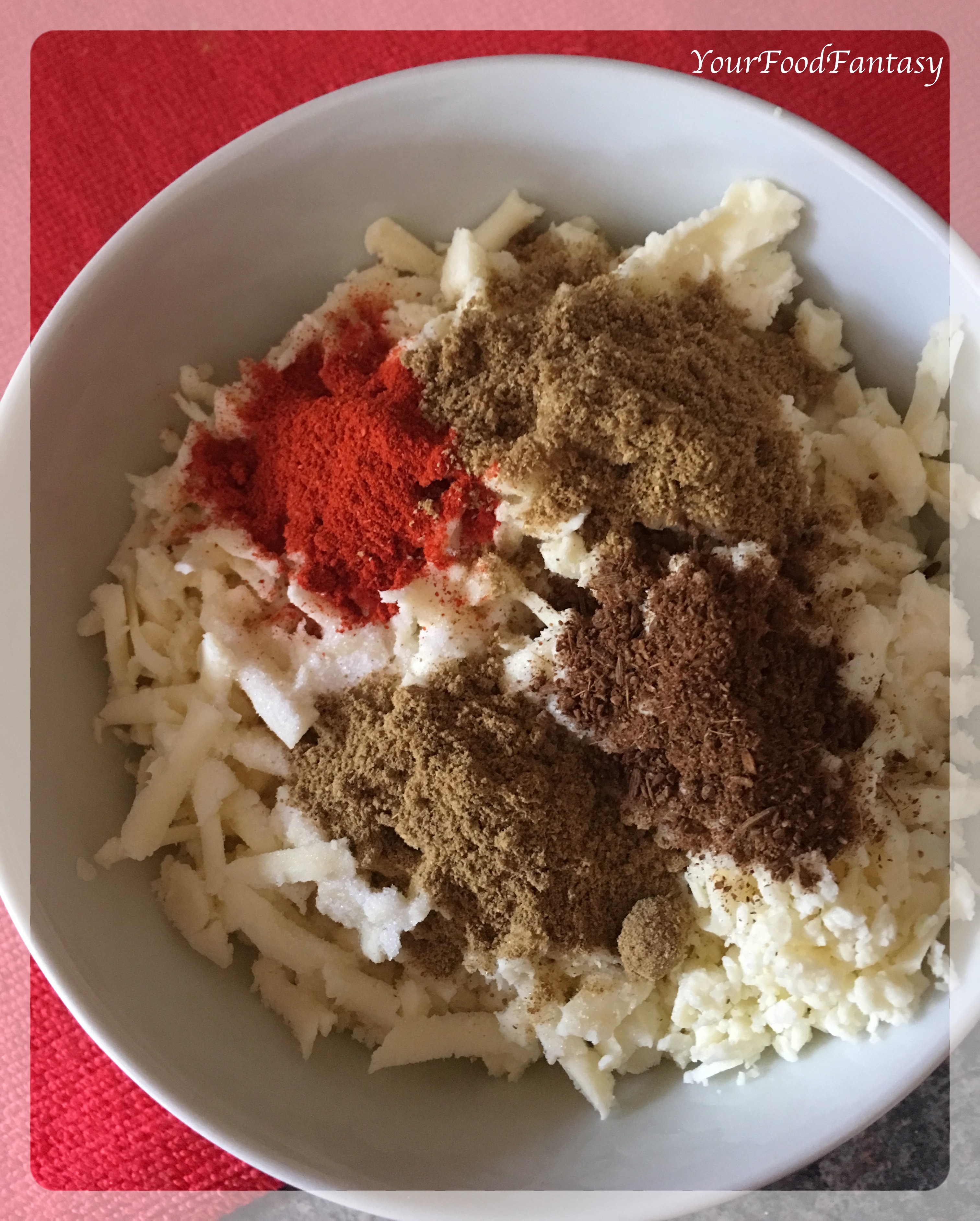In an another mixing bowl, either crumble the paneer with your hands or you can grate it with grater or food processor.