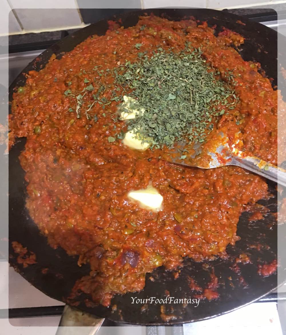 Add Ginger Garlic paste and saute till the raw smell evades. Add rest of the pav bhaji masala.