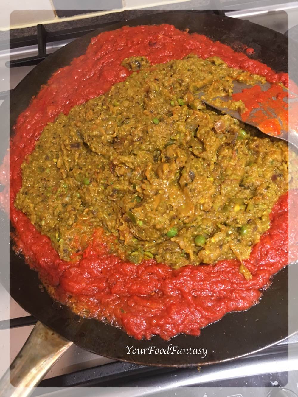 Now add tomato puree concentrate. Iused this just to get nice colour for bhaji, you can totally skip it if you don’t like to add. Mix well and saute for 2 minutes.