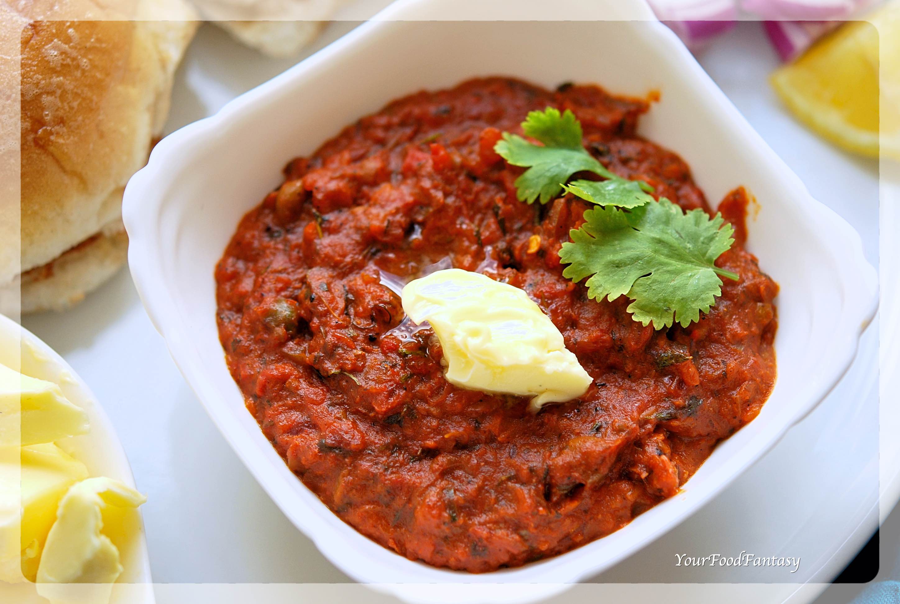 Now serve the pav bhaji hot topped with rest of the butter and some chopped onions.