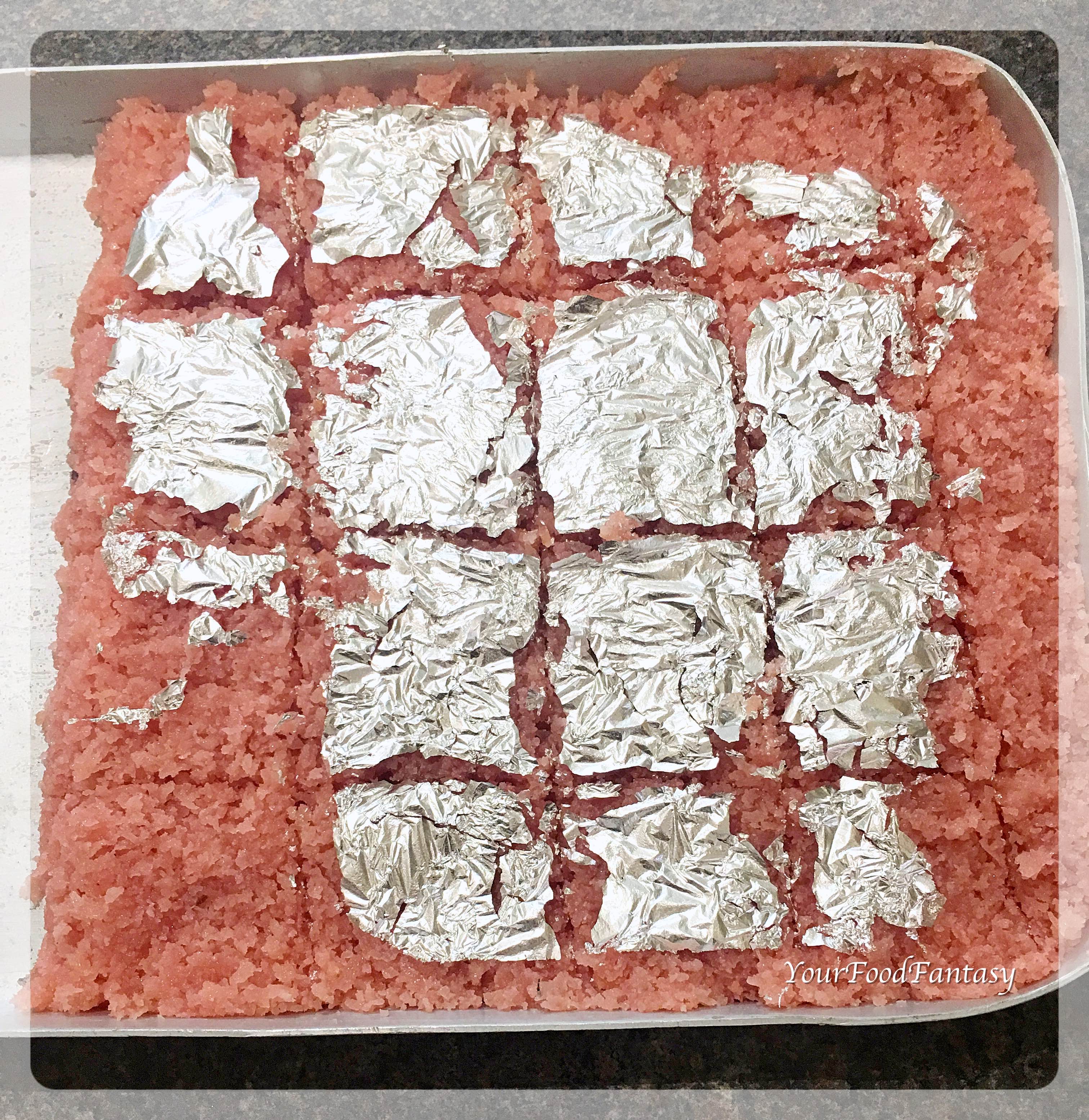 Grease an aluminium tray with 1 teaspoon of Desi ghee. Spread the coconut mixture evenly and allow to set. Once it’s lukewarm, Stick the silver vark and spread Chopped Almonds and pistachios.