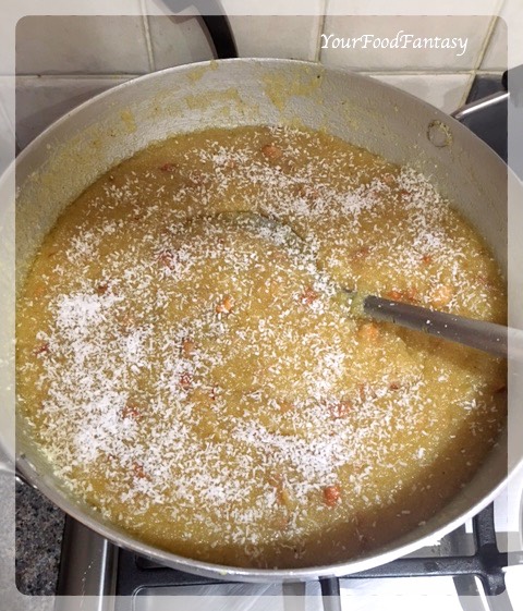 Once it reaches your desired consistency, add Cardamom powder and desiccated coconut. Mix them properly and switch off the flame.